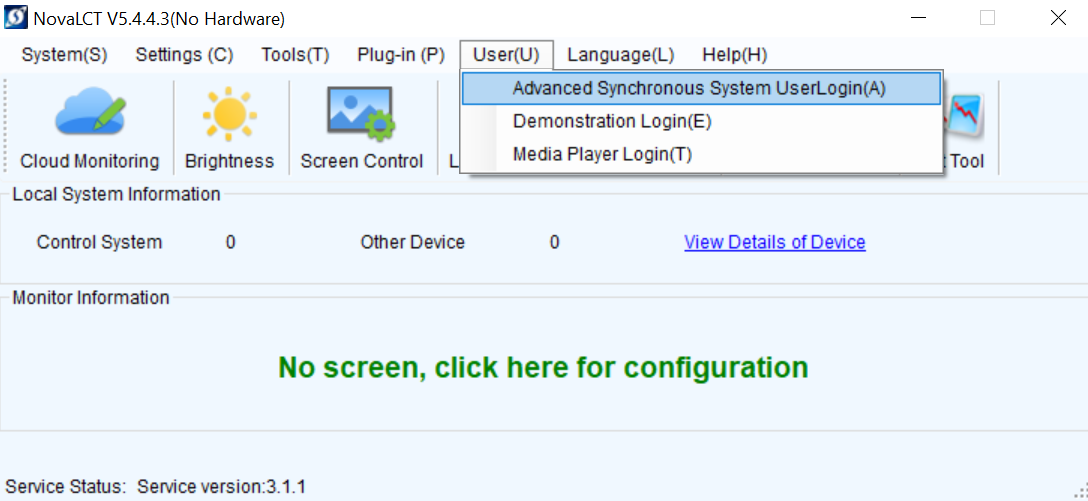 Wurde der Controller zwischenzeitlich für eine andere Wand verwendet, oder die Konfiguration gelöscht, kann diese mithilfe folgender Datei (teststand.zip) wiederhergestellt werden. Hierzu muss der Controller per USB-Kabel an einen PC angeschlossen werden, auf dem die NovaLCT Software (https://novastar.shop/download-software/) installiert ist. Innerhalb der Software muss man sich unter „User“ als „Advanced Synchronus System User“ anmelden. Das Passwort lautet 666.
