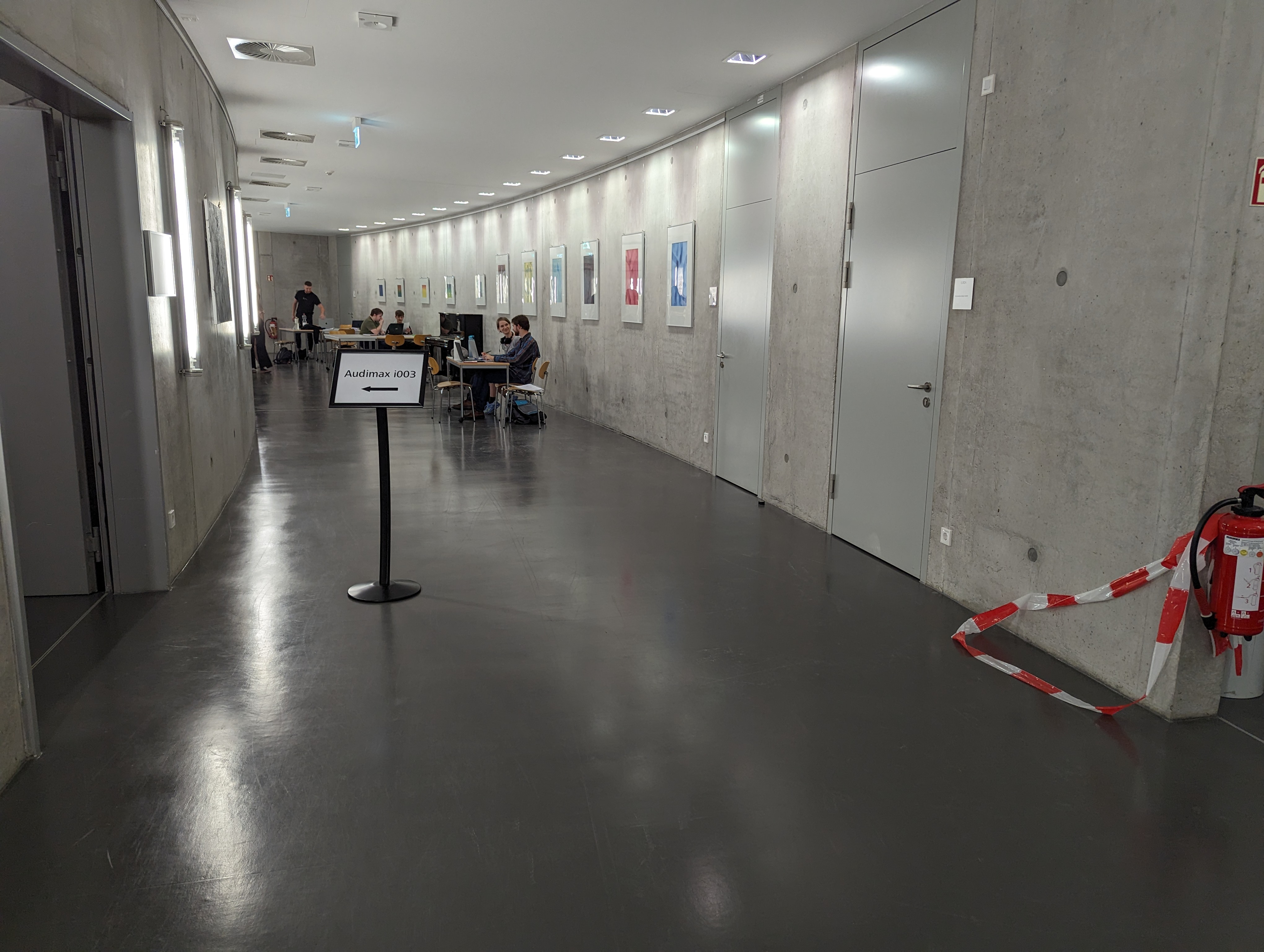 Besucher sollen über die Tür links neben dem Haupteingang von N8 direkt durch das Treppenhaus durch den Keller zum unteren Eingang des Audimax geleitet werden. Der Auslass ist über die oberen Türen durch das Foyer N8. So soll vermieden werden, dass die Leute die auf Einlass warten auf die treffen, die den Raum verlassen. Damit das funktioniert, braucht es folgende Teile: